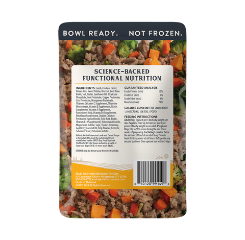 Discover Health Extension’s Gently Cooked recipes - perfect for dogs that crave a fresh home cooked meal. These small batch recipes include a unique blend of powerful superfoods to boost immunity including goji berry, sage, thyme, kelp, turmeric and coconut oil. Gently Cooked is complete and balanced for dogs of all ages. Fresh lamb, beef, or chicken is our first ingredient. Whole vegetables include carrots, sweet potatoes, broccoli. Plus, Gently Cooked is never frozen and always bowl ready for your dog.